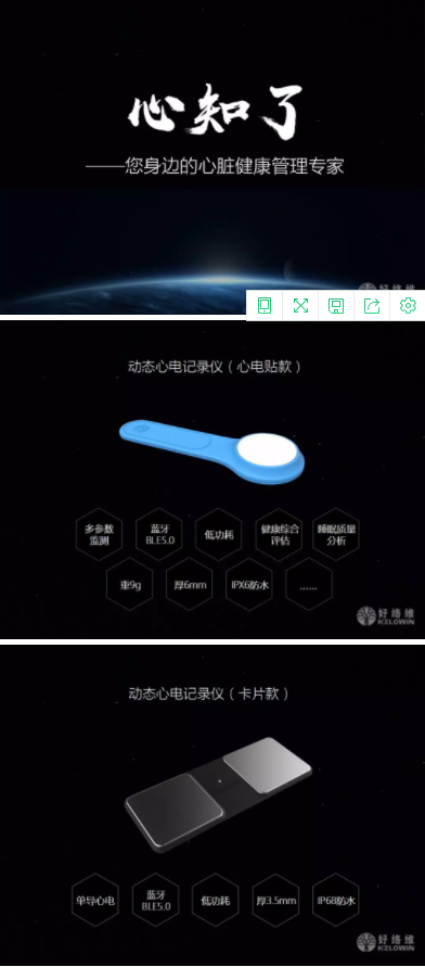 “心知了”是在國家遠程醫療與互聯網醫學中心指導下研發并運營的,擁有健康綜合評估、睡眠質量分析、精神壓力和疲勞指數分析、專業的心電診斷、心臟疾病風險評估等功能。它不同于以往產品的導聯線模式,而采取藍牙BLE5.0技術,通過手機APP實現云端人工智能診斷,診斷分析可達到主任醫師水平。“心知了”全重僅9克、厚6毫米,設計小巧、穿戴舒適;納瓦級超低功耗設計,可連續穿戴監測48小時,可精準捕捉短促異常信號;IPX6防水設計可防汗、防水,適合全天候穿戴使用。
